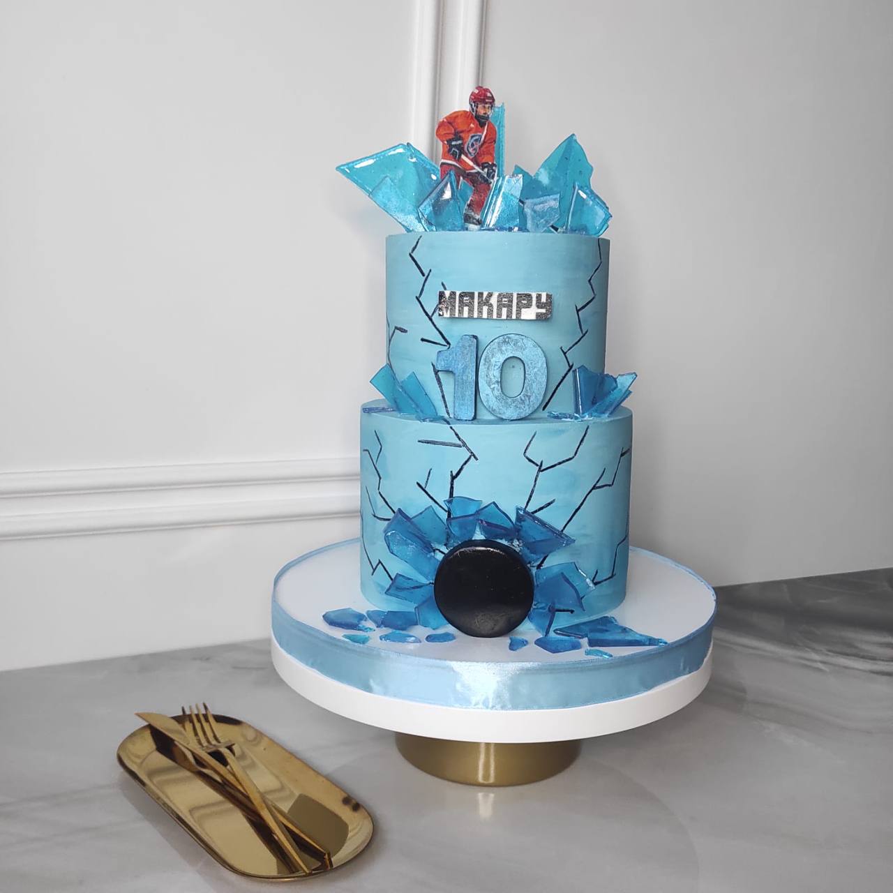 Торт с нежным кремом, украшенный фигурками атакующих игроков.